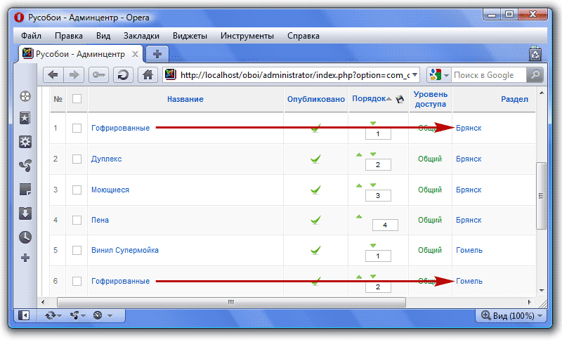 Итак, на нашем сайте уже есть верхнее меню и статьи к нему относящиеся. Теперь нам надо реализовать меню каталога товаров. Давайте посмотрим на сайт-образец. Если пощелкать по пунктам меню каталога товаров, то становится видна некоторая закономерность. Каждая страница, на которую ссылается пункт меню представляет собой список ссылок на другие страницы. Иными словами, меню каталога товаров - это список разделов товаров, в каждом из которых есть свои категории. Например, Брянск - это раздел, в нем есть категории: гофрированные обои, дуплекс, моющиеся обои и пена.Чтобы реализовать меню каталога товаров, нам надо сделать следующее: