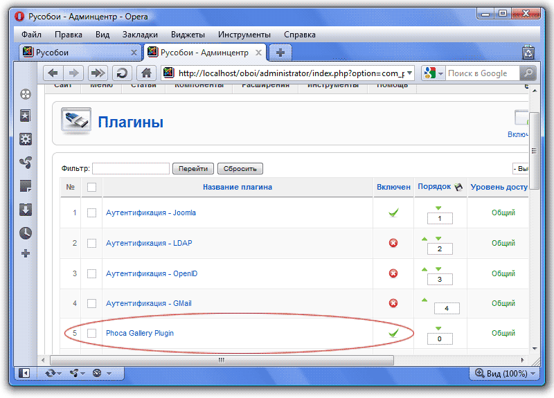 что плагин Phoca Gallery включен (в столбце Включен стоит зеленая галочка):