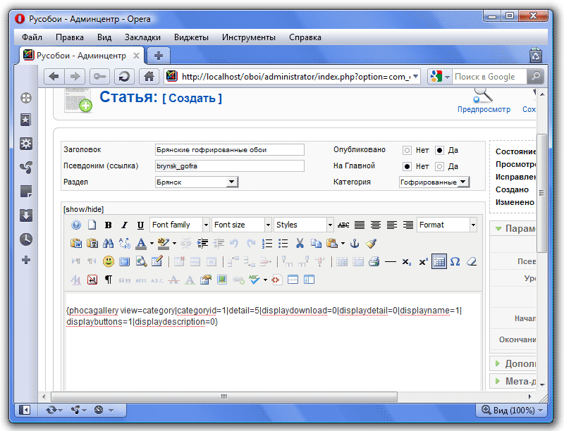 - Заголовок - Брянские моющиеся обои, Псевдоним - moyka, Раздел - Брянск, Категория - Моющиеся. В поле контента вставляем код отображения галереи с параметром categoryid=3