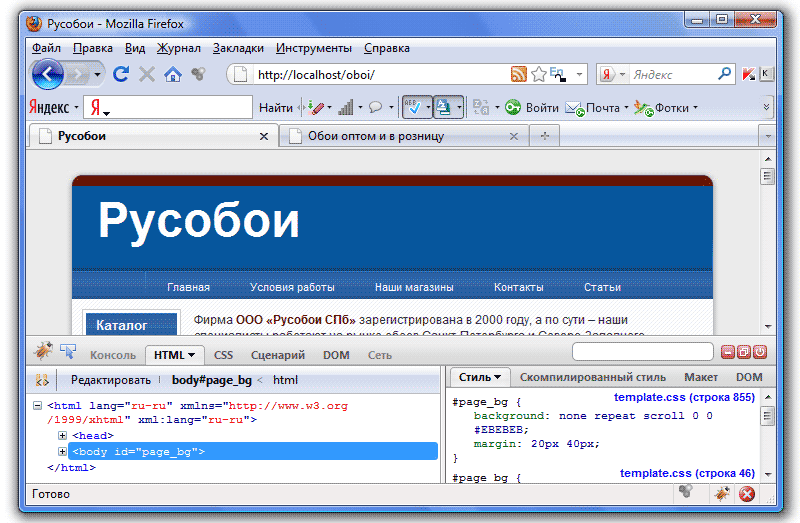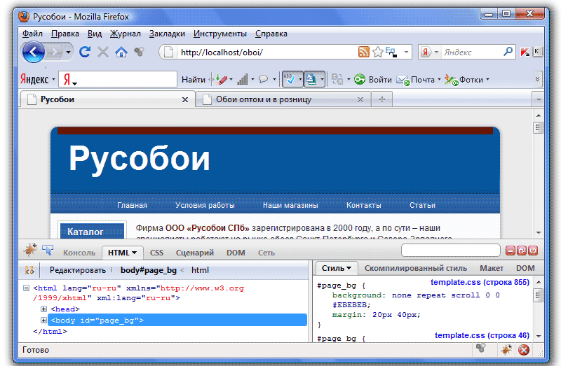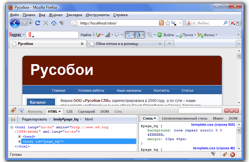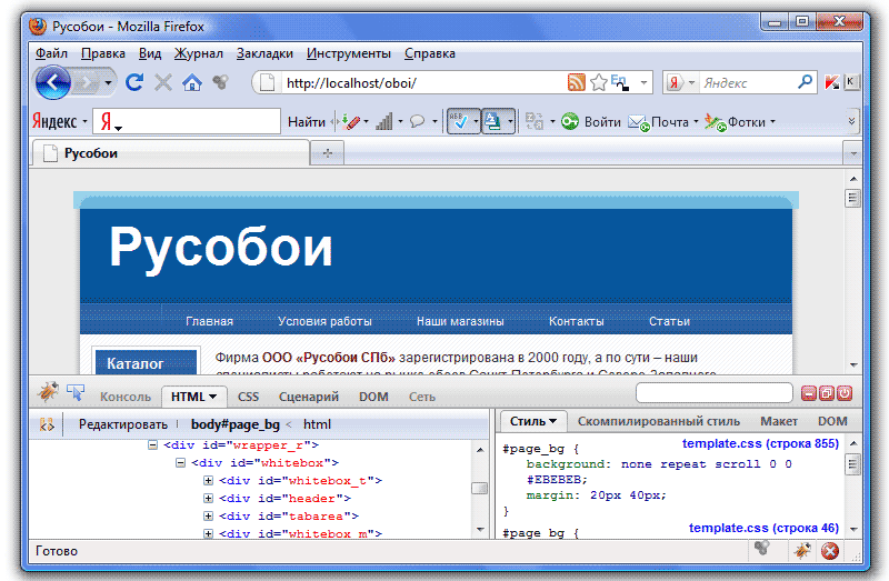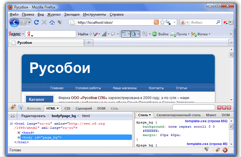 Изучив html-разметку, мы будем точно знать, из каких элементов состоят наши страницы, а соответственно можем изменить их внешний вид. Но наверно, вы уже обратили внимание, что представить по коду внешний вид страницы крайне сложно (хотя и возможно). Конечно, есть способ облегчить эту задачу, и имя ему - плагин Firebug для браузера FireFox. Скачать его можно, например, здесь, далее открыть браузер FireFox, выбрать в меню Инструменты - Дополнения и в открывшемся окне включить расширение Firebug. После перезагрузки браузера, в его нижнем правом углу появится значок плагина (жук):