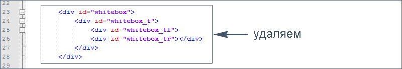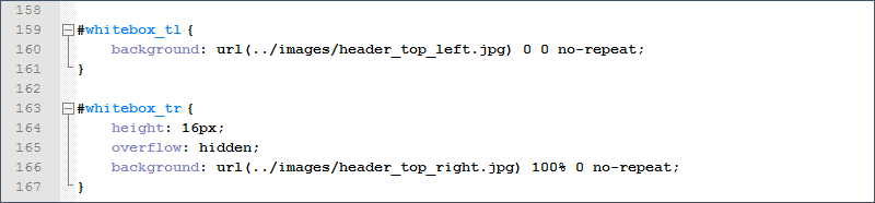 Теперь надо также заменить картинки слева и справа этого div-а, возвращаемся в FireFox, щелкаем по плюсику рядом с <div id="whitebox_t"> и видим его содержимое: <div id="whitebox_tl"> - отвечает за левый угол и <div id="whitebox_tr"> - отвечает за правый угол. Ищем эти идентификаторы на странице template.css