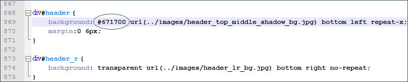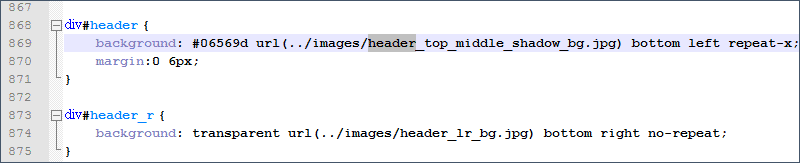 Видим, что по сути наша шапка залита синим цветом (#06569d), вдоль нижнего края шапки (bottom) по горизонтали (repeat-x) повторяется картинка header_top_middle_shadow_bg.jpg, которая представляет собой синий квадратик с затемненным низом (эффект тени). Если мы посмотрим на сайт-образец, то увидим, что у нас по низу шапки идет белая полоса, а сам фон шапки имеет цвет #671700.