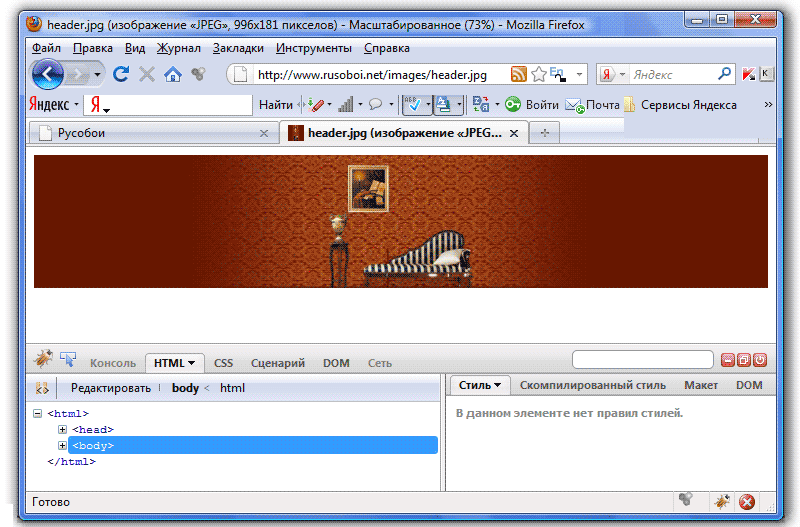 Снова щелкаем по тегам на панели Firebug, ищем тег, отвечающий за шапку сайта, и находим его - <div id="header">