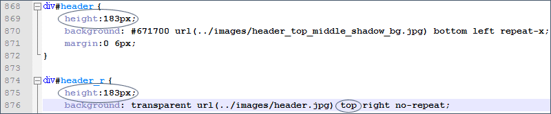 Смотрим на результат и видим, что вставленное изображение шире нашей шапки. Действительно наше изображение имеет высоту 181 пиксел, Значит наши теги <div id="header"> и <div id="header_r"> должны иметь высоту 181 пиксел (высота изображения) + 2 пиксела (так как должна быть видна белая полоска внизу), т.е. 183 пиксела. К тому же сама картинка должна быть прижата к верху (top), а не к низу (bottom), как сейчас указано в стилях. Давайте добавим эти изменения: