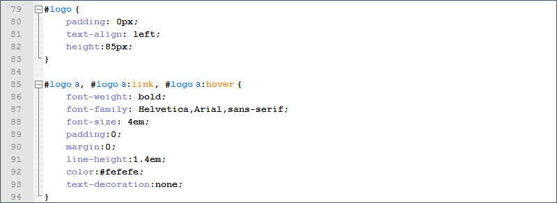 Теперь будем разбираться с <div id="logo">, именно он отвечает за внешний вид надписей в шапке. У нас это одна надпись слева - Русобои (название фирмы), а нам необходимо сделать две надписи: одну слева - название и слоган, а другую справа - с адресом и телефоном. Итак, ищем идентификатор logo на странице стилей: