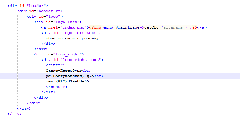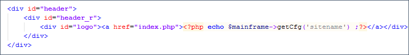 На странице index.php видим, что в <div id="logo"> выводится ссылка с названием фирмы посредством программного кода, который мы договорились не трогать, да нам это и не нужно, ведь название у нас такое же (его, кстати, при желании можно изменить из администраторской зоны, поменяв название сайта).