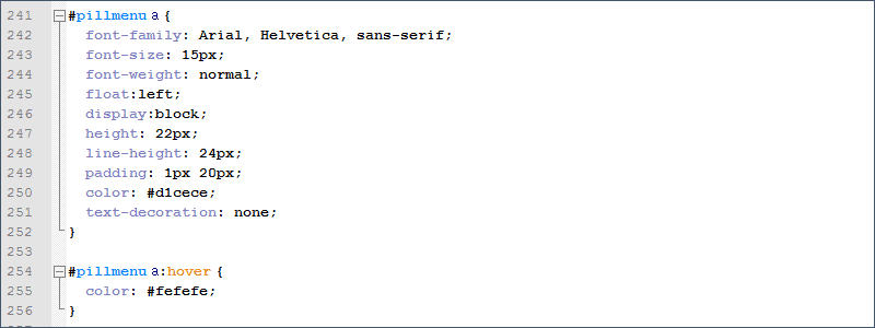 Далее ссылки в меню надо сделать покрупнее и серыми, а при наведении курсора мыши - белыми. За ссылки в главном меню отвечает тег с id="pillmenu", поменяем немного стили: