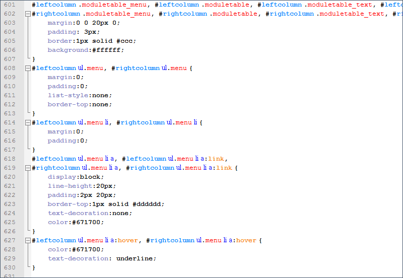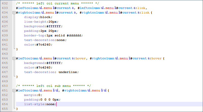 Теперь то же самое с меню каталога товаров, за него отвечает тег <div id="leftcolumn">. Синяя верхняя полоса - это фон для тега <h3> (menu_t.jpg), находящегося внутри тега <div id="leftcolumn">. Открываем эту картинку в photoshop и меняем цвет на коричневый. Вообще-то на сайте-образце цвет фона у меню белый, но мне кажется, что с коричневой полосой как-то симпатичнее. А вот внутри серый фон можно убрать, для этого надо поудалять свойства backgroud и border в стилях, отвечающих за пункты меню, а цвет самих пунктов сделать коричневым, а при наведении курсора мыши - подчеркнутым. Вот стили с изменениями :