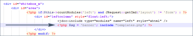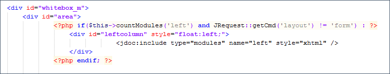 Давайте рассмотрим файл index.php. В нем html-разметка отвечает за расположение элементов на странице. Все, что заключено в <jdoc /> или в <?php ?> - это программный код, отвечающий за вывод информации из базы данных или подключение других файлов. Например, тексты наших статей, название сайта... - все это хранится в базе данных и выводится на страницы с помощью программного кода. Для изменения шаблона нас интересует только html-разметка, программный код трогать не надо, иначе ваш сайт перестанет работать так, как должен.