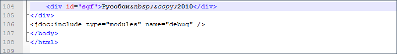 Теперь такая же ситуация у нас в <div id="sgf">, хорошо бы убрать надпись "Русобои, Powered by Joomla! and designed by SiteGround web hosting", но она также подставляется программным кодом:
