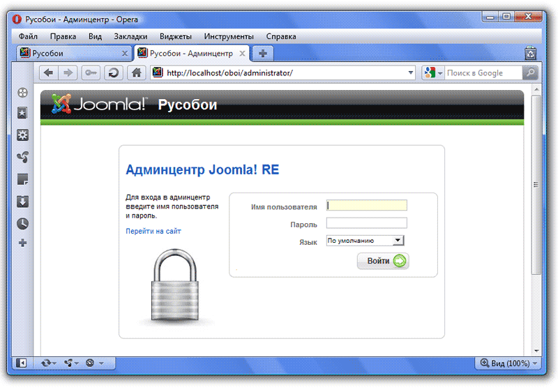 Для этого нам сначала нужно попасть в администраторскую панель управления сайтом. Открываем еще одну вкладку в браузере и набираем адрес администраторской панели - http://localhost/oboi/administrator (т.е. к адресу сайта дописываем слово administrator). И видем страницу входа в административный раздел:
