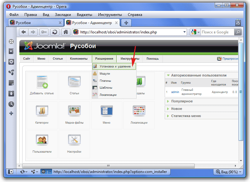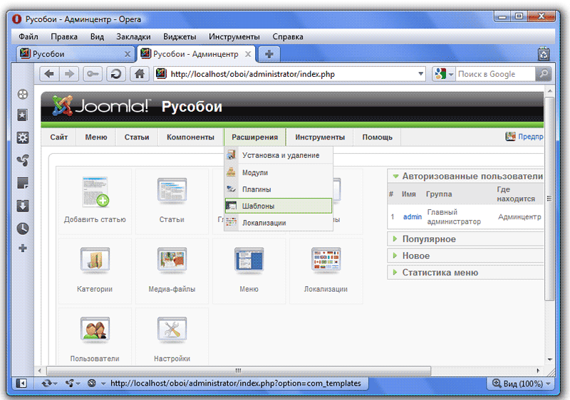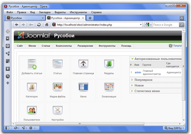 Вводим логин - admin, пароль - 1111 (или тот который указали вы при установке Joomla), нажимаем кнопку Войти и попадаем в администраторскую зону: