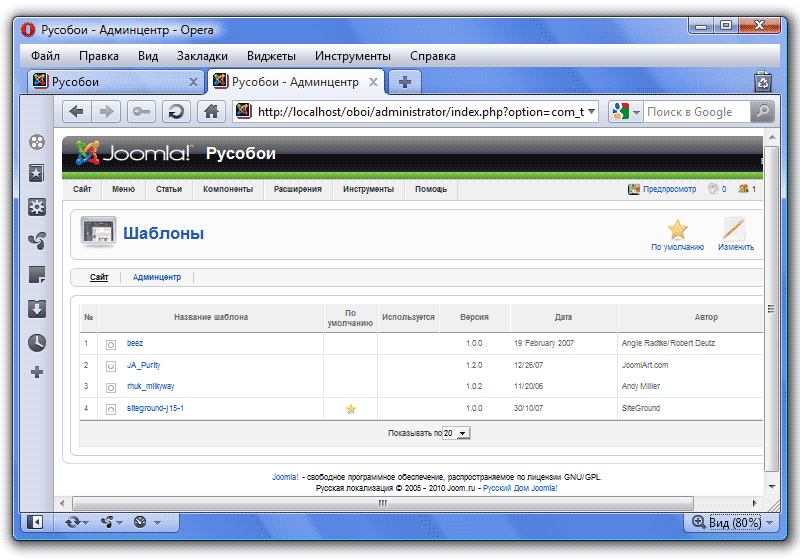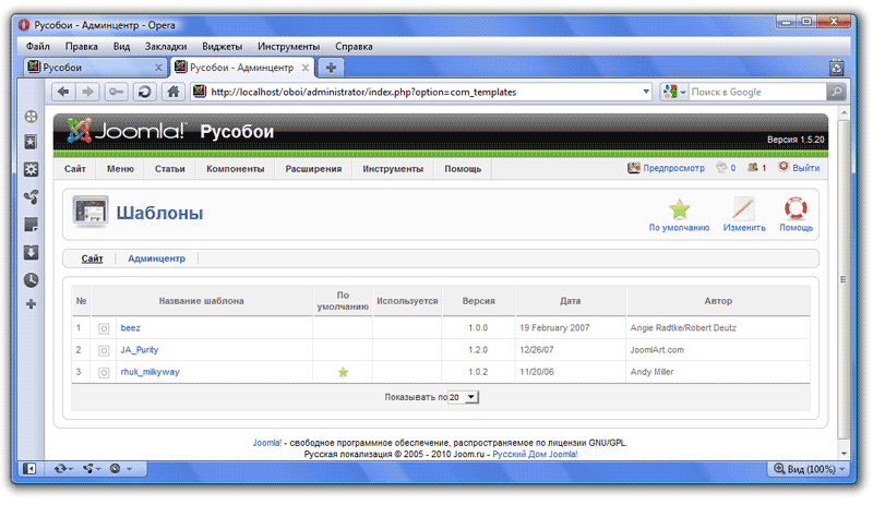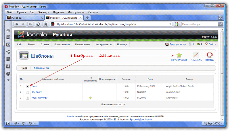 Теперь мы снова идем в Расширения - Шаблоны и делаем только что установленный шаблон шаблоном по умолчанию (это мы уже умеем):
