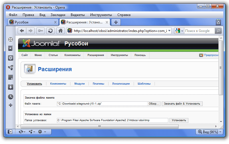 Для этого скачайте шаблон siteground-j15-1.zip к себе на компьютер. Теперь идем в администраторскую зону: Расширения - Установка и удаление