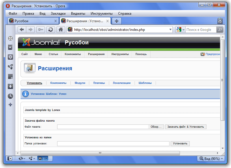 Через несколько секунд Joomla сообщает, что шаблон удачно установлен: