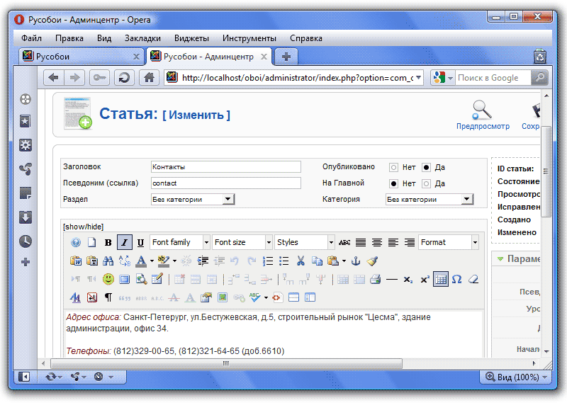 Итак, создаем материал под названием Контакты (contact). Копируем текст материала, кроме карты, форматируем и сохраняем статью: