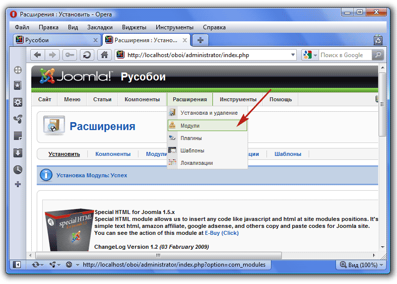 Итак, скачайте модуль к себе на компьютер. Теперь идем в Расширения - Установка и удаление. Нажимаем на кнопку Обзор, выбираем модуль mod_specialhtml_J15.zip и нажимаем на кнопку Закачать файл (подробно об установке расширений мы говорили в 5 уроке).