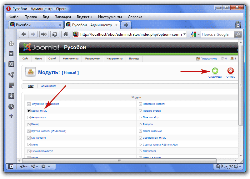 Ставим галочку у Special HTML и нажимаем кнопку Следующая: