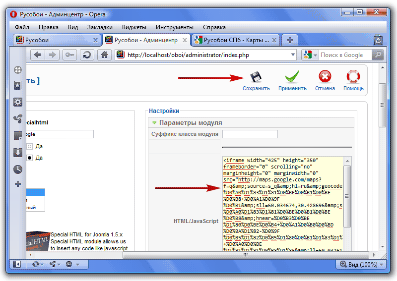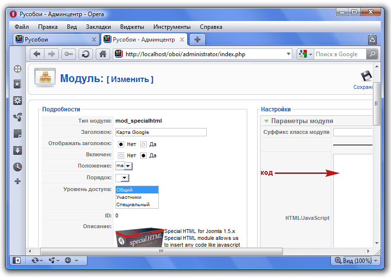 - В параметрах модуля, на вкладке HTML/JavaScript нам надо указать код нашей карты.