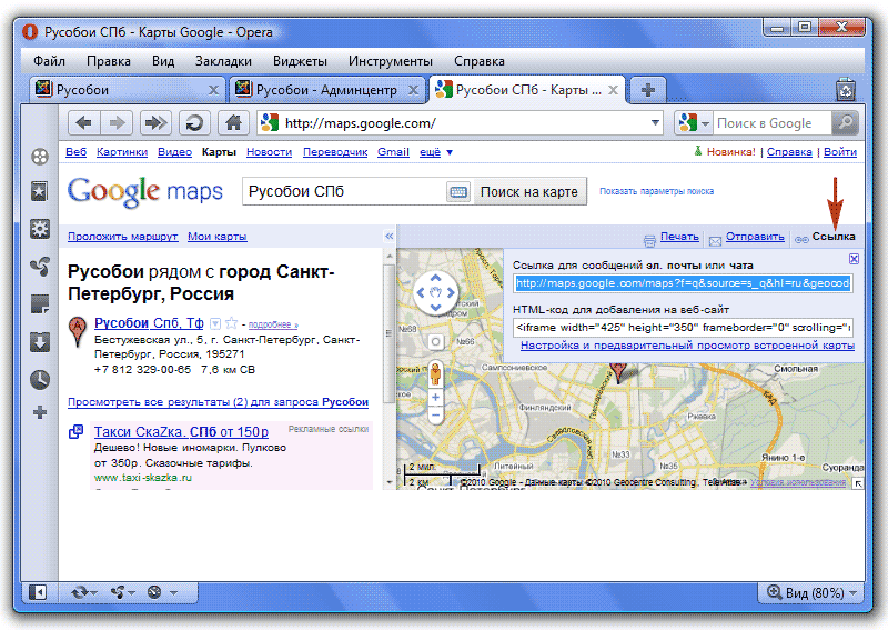 Чтобы получить код карты, мы идем на http://maps.google.com/. В строке поиска набираем название фирмы сайта-образца - Русобои СПб. Появляется карта с местоположением нашей фирмы, нажимаем на кнопку Ссылка и видим HTML-код для добавления на сайт: