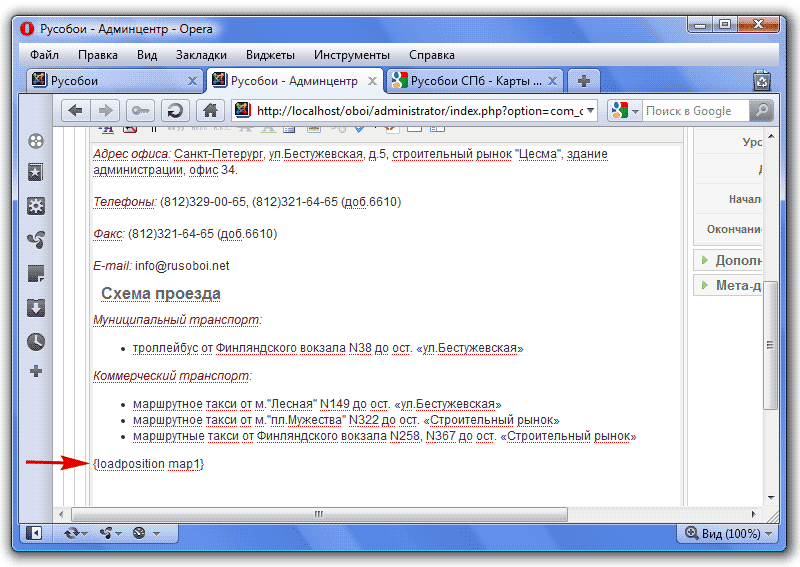 Теперь идем в Статьи - Статьи, выбираем нашу статью Контакты и открываем ее для редактирования. Встаем курсором мыши в то место, где должна быть наша карта и пишем следующую команду: