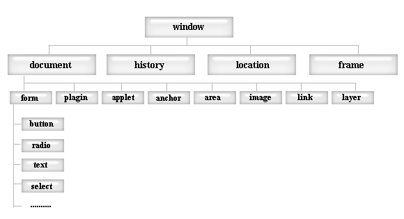 На самом верхнем уровне находится объект window, представляющий окно браузера и являющийся "родителем" всех остальных объектов. Расположенные ниже могут иметь свои подчиненные объекты. Так объект document (текущая страница) может иметь дочерний объект form (форма) и т.д.