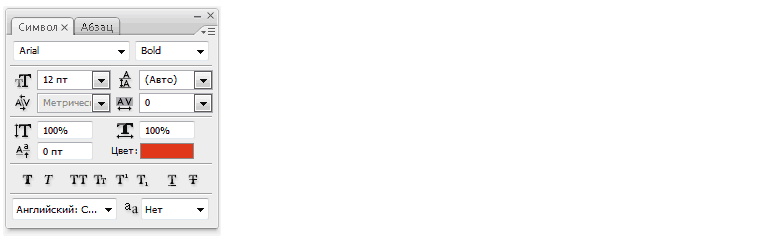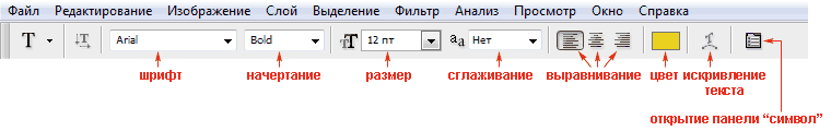 Если у вас другая версия программы Photoshop, то такой иконки на панели параметров может и не быть. Тогда для открытия панели "символ" в меню выберите пункт Окно -> Символ. Попробуем на деле: