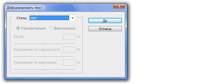 Теперь щелкните по "искривление текста" на панели параметров. Откроется окно: