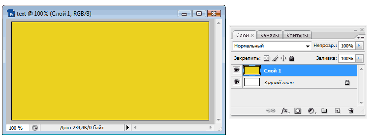 Выключите слой 1 (щелкнув по глазику) и на нашем изображении вы увидите белый фон. Включите слой (щелкните еще раз) и увидите желтую заливку.