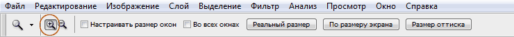 На панели параметров этого инструмента щелкните по лупе с плюсиком.