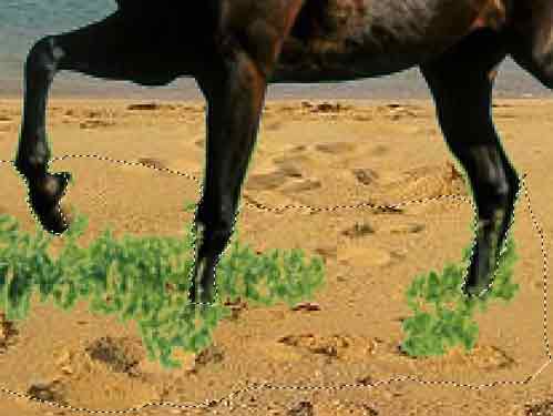 Теперь, когда наш конь выделен, нам нужно удалить все лишнее. Для этого в меню выберем команду Выделение -> Инверсия (Select -> Inverse). Теперь будет выделена вся область вокруг коня. Жмем Del на клавиатуре и получаем нашего вырезанного коня на фоне моря: