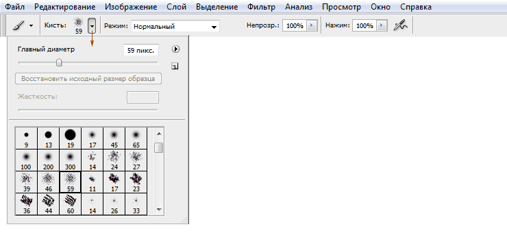 На панели параметров этого инструмента выберите кисть, напоминающую песок (т.е. с неровными краями).
