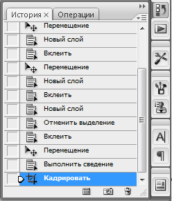 В этой палитре фиксируются все ваши действия, нашим последним действием было кадрирование, щелкните на предыдущий шаг (Выполнить сведение), наше изображение снова имеет несколько слоев. Таким образом, можно откатывать шаги назад, если результат каких-либо изменений вам не нравится. Есть один нюанс: палитра "История" запоминает только 20 последних шагов. Подробнее о палитре "История" будет рассказано в уроке 8.