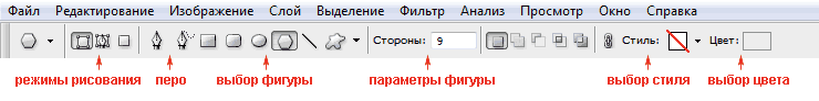 Здесь представлены основные фигуры, которыми мы можем воспользоваться. Выберете любую и посмотрите на панель параметров: