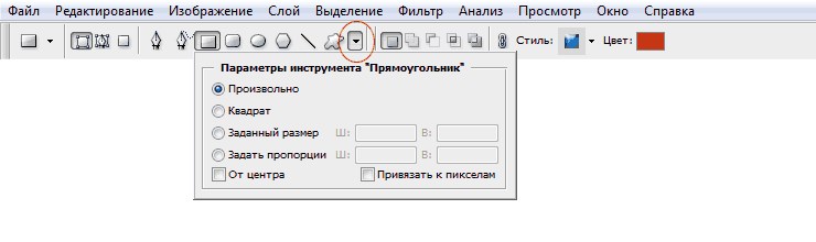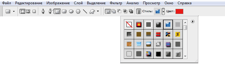 Выберем первую фигуру - прямоугольник. На панели выберем режим - слой-фигура. Выберем стиль, щелкнув по треугольнику справа.