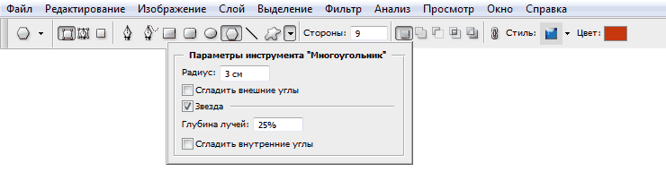 Второй девятиугольник имеет радиус 3см, галочка у -звезда-, глубина лучей - 25%, остальные галочки сняты.