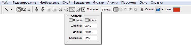 Выберем фигуру - линии. На панели выберем режим - слой-фигура, толщину линии (в пикселах), цвет и стиль. Рассмотрим геометрические параметры: