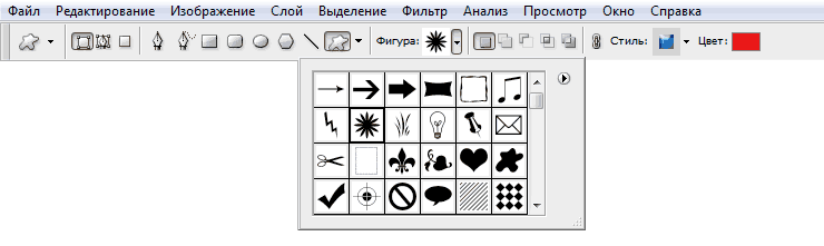 Выберем фигуру - произвольная фигура. На панели выберем режим - слой-фигура, цвет и стиль. Геометрические параметры такие же как у прямоугольника. Зато здесь есть выбор самой фигуры: