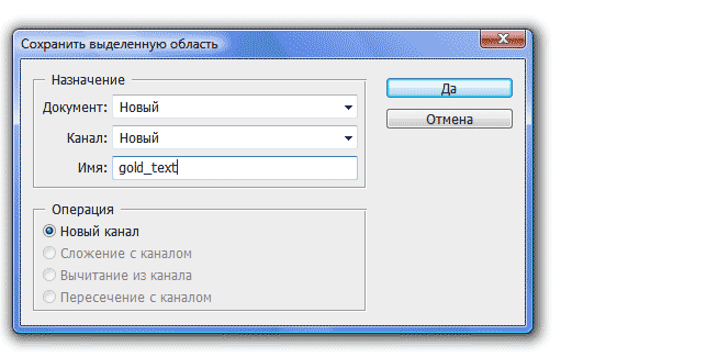 Теперь нужно сохранить это выделение как альфа-канал. Для этого выбираем в меню Select -> Save Selection (Выделение -> Сохранить выделенную область) и в появившемся окне даем название каналу (например, gold_text):