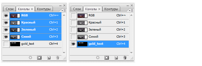 Теперь на панели слоев переходим на вкладку "Каналы" и включаем созданный канал (при этом канал RGB выключится):