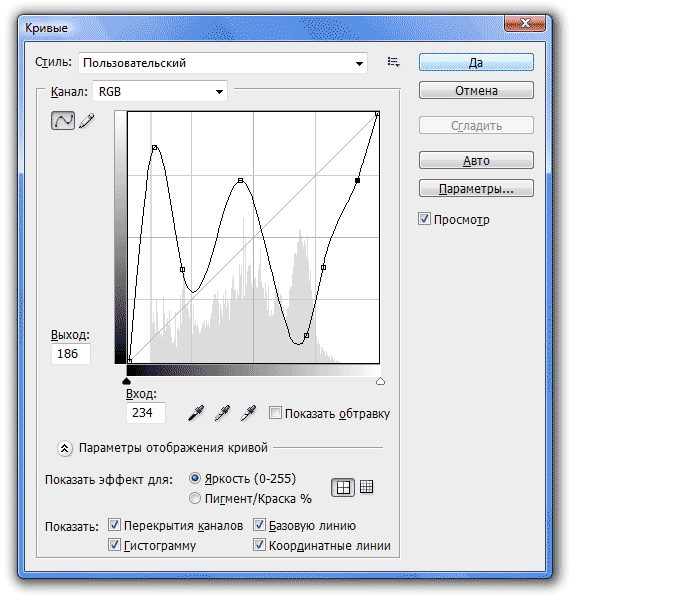 Теперь придадим буквам металлический вид и делать это будем через кривые. Для этого убедимся, что у нас включена английская раскладка клавиатуры и нажмем Ctrl + M. В появившемся окне постройте похожую кривую: