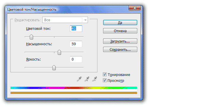 Теперь добавим золота нашим буквам. Для этого убедимся, что у нас включена английская раскладка клавиатуры и нажмем Ctrl + U. В появившемся окне зададим следующие параметры (убедимся, что поставили галочку у Colorize (Тонирование)):