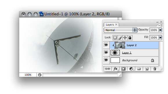 Имеется также возможность использовать прозрачность любого растрового слоя для создания обтравочной маски. На примере ниже, я использовал слой, содержащий широкий мазок мягкой кистью, в качестве базового слоя.