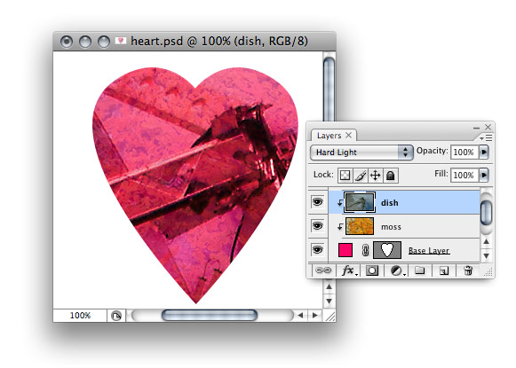 Можно настроить полупрозрачность и режимы смешивания и отдельно для всех обтравочных слоев, что является хорошим способом создания сочных детальных изображений. На образце ниже, базовый слой – розовое сердце. Слой «мох» обеспечивает текстуру и установлен на уровне 28% непрозрачности. Слой «техника» (центр спутниковой антенны) настроен на режиме смешивания «Жесткий свет», позволяющему приобретать структуру слоя «мох».