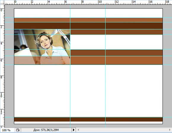 Теперь опустим направляющие, деля ими макет на структурные элементы (возможно они у вас уже есть). Если у вас не отображены линейки, то выберите в меню: Просмотр -> Линейки или нажмите Ctrl+R. Чтобы опустить направляющую подведите курсор мыши к верхней линейке, нажмите левую клавишу мыши и тащите направляющую вниз. Так можно опустить сколько угодно направляющих. Аналогично подведите курсор мыши к левой линейке, нажмите левую клавишу мыши и тащите направляющую вправо.