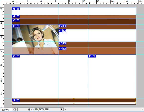 Если мы разрежем по направляющим, то получится много лишних частей макета. Например, в первой строке у нас будет располагаться название фирмы, т.е. это единая картинка. Поэтому подумаем внимательно как лучше резать, представляя мысленно как потом это будем верстать.